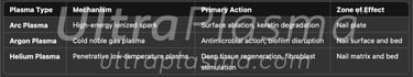 Onychomycosis (tinea unguium) is a prevalent fungal infection of the nail unit, often caused by dermatophytes, Candida species, and nondermatophytic molds. Traditional antifungal therapies suffer from long treatment durations, recurrence, and limited nail penetration. The UltraPlasma™ multi-platform plasma system—utilizing arc, argon, and helium plasma technologies—offers a novel, non-invasive treatment modality. This review details the mechanism of UltraPlasma™ in fungal nail infections, emphasizing its interaction with nail layers, pathogen types, and the biochemical activity of generated reactive gases such as ozone (O₃), nitric oxide (NO), and reactive oxygen/nitrogen species (RONS). Figures illustrate emission spectra, cross-sectional nail penetration, gas interactions, and clinical progress. The integration of photothermal, photochemical, and bioelectric effects renders this method an effective solution for resistant or recurrent onychomycosis.